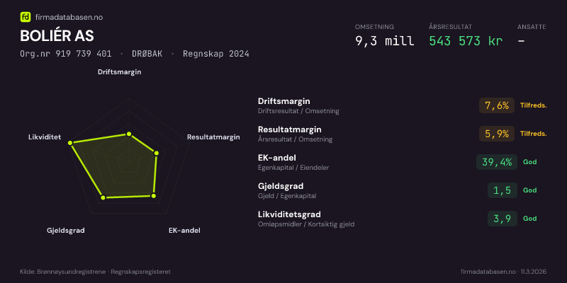 BOLIÉR AS hadde en omsetning på 9,3 MNOK for regnskapsåret 2024 ifølge siste innsendte årsregnskap. Regnskapstallene hentes fra Brønnøysundregistrene.
