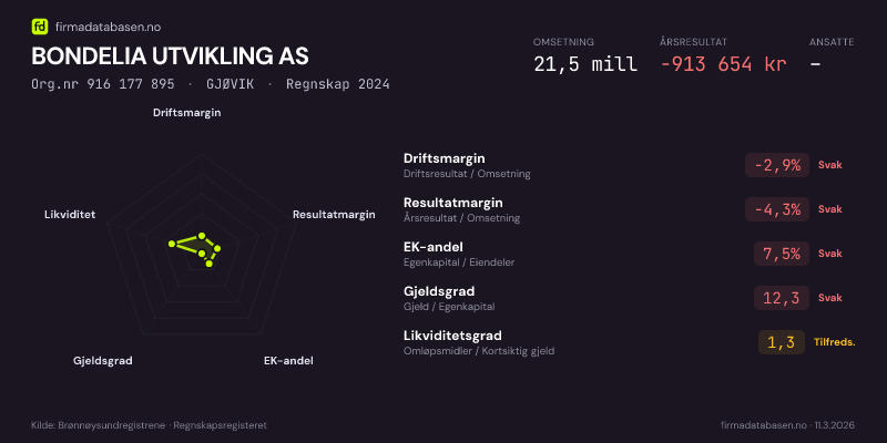 BONDELIA UTVIKLING AS hadde en omsetning på 21,5 MNOK for regnskapsåret 2024 ifølge siste innsendte årsregnskap. Regnskapstallene hentes fra Brønnøysundregistrene.