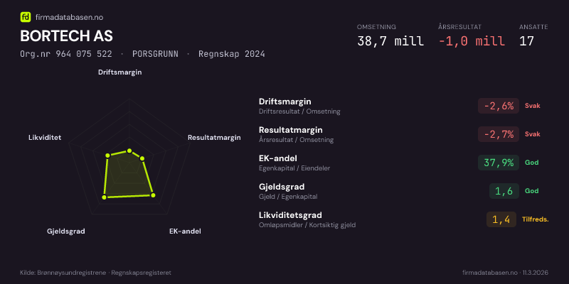 BORTECH AS hadde en omsetning på 38,7 MNOK for regnskapsåret 2024 ifølge siste innsendte årsregnskap. Regnskapstallene hentes fra Brønnøysundregistrene.