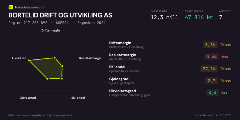 BORTELID DRIFT OG UTVIKLING AS hadde en omsetning på 12.3 mill i 2024, med driftsmargin på 6.3%.