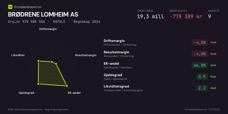 BRØDRENE LOMHEIM AS hadde en omsetning på 19,3 MNOK for regnskapsåret 2024 ifølge siste innsendte årsregnskap. Regnskapstallene hentes fra Brønnøysundregistrene.