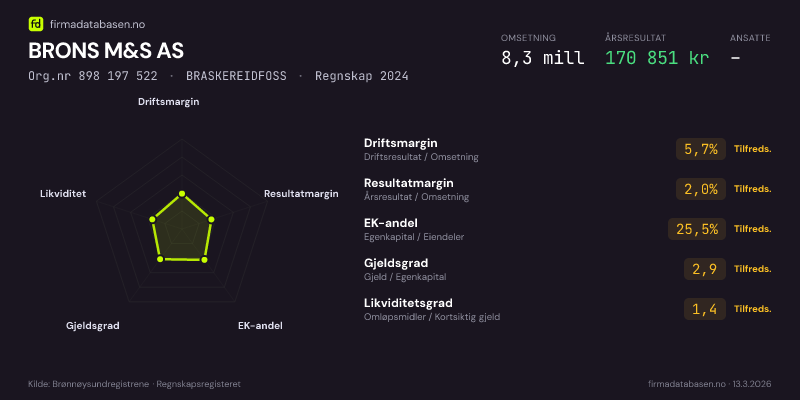 BRONS M&S AS,BRASKEREIDFOSS — jo større areal, jo sterkere økonomi.Org.nr 898 197 522 · Regnskap2024