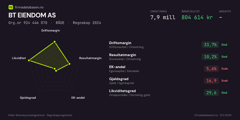 Firmadatabasen.no oppdateres nattlig med nye data fra Brønnøysundregistrene. Endringer i roller, adresse, status og andre registerdata fanges opp automatisk. Du kan følge BT EIENDOM AS og få varsel på e-post når vi registrerer endringer — klikk «Følg selskap» øverst på denne siden.