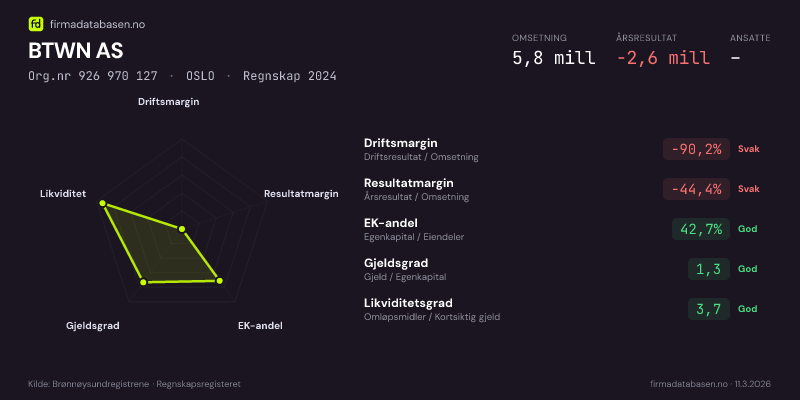 BTWN AS hadde en omsetning på 5,8 MNOK for regnskapsåret 2024 ifølge siste innsendte årsregnskap. Regnskapstallene hentes fra Brønnøysundregistrene.