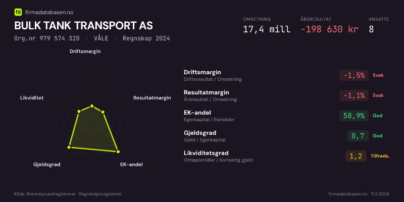 BULK TANK TRANSPORT AS,VÅLE — jo større areal, jo sterkere økonomi.Org.nr 979 574 320 · Regnskap2024