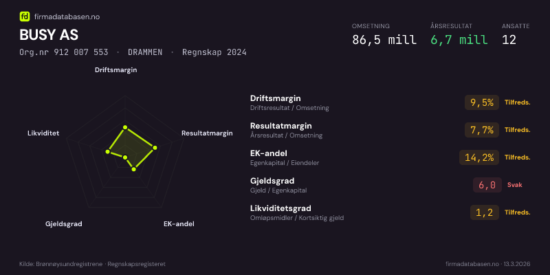 BUSY AS hadde en omsetning på 86,5 MNOK for regnskapsåret 2024 ifølge siste innsendte årsregnskap. Regnskapstallene hentes fra Brønnøysundregistrene.