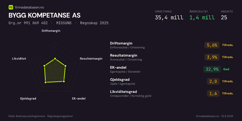 BYGG KOMPETANSE AS hadde en omsetning på 35,4 MNOK for regnskapsåret 2025 ifølge siste innsendte årsregnskap. Regnskapstallene hentes fra Brønnøysundregistrene.