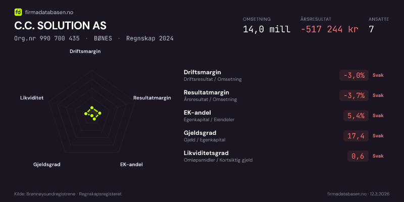 C.C. SOLUTION AS hadde en omsetning på 14,0 MNOK for regnskapsåret 2024 ifølge siste innsendte årsregnskap. Regnskapstallene hentes fra Brønnøysundregistrene.