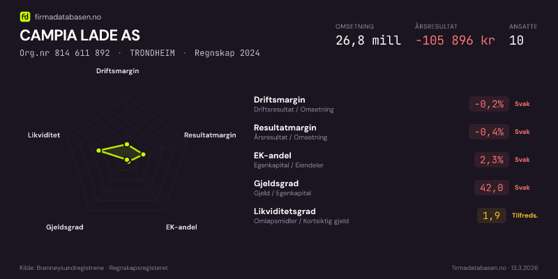 CAMPIA LADE AS hadde en omsetning på 26.8 mill i 2024, med driftsmargin på -0.2%.