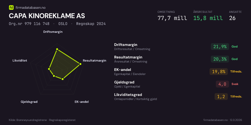 CAPA KINOREKLAME AS hadde en omsetning på 77,7 MNOK for regnskapsåret 2024 ifølge siste innsendte årsregnskap. Regnskapstallene hentes fra Brønnøysundregistrene.