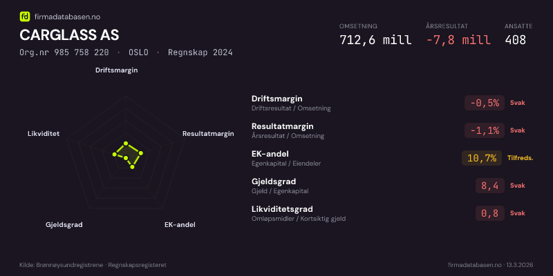 CARGLASS AS hadde en omsetning på 712.6 mill i 2024, med driftsmargin på -0.5%.
