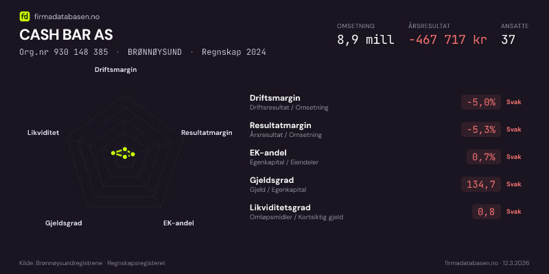 CASH BAR AS,BRØNNØYSUND — jo større areal, jo sterkere økonomi.Org.nr 930 148 385 · Regnskap2024