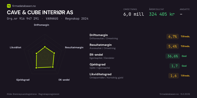 CAVE & CUBE INTERIØR AS,VARHAUG — jo større areal, jo sterkere økonomi.Org.nr 916 947 291 · Regnskap2024