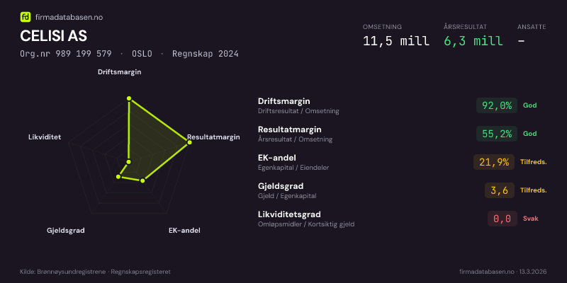 CELISI AS hadde en omsetning på 11,5 MNOK for regnskapsåret 2024 ifølge siste innsendte årsregnskap. Regnskapstallene hentes fra Brønnøysundregistrene.