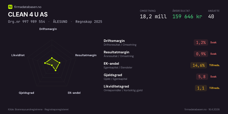 CLEAN 4 U AS,ÅLESUND — jo større areal, jo sterkere økonomi.Org.nr 997 989 554 · Regnskap2025