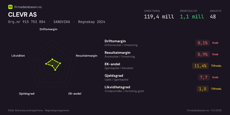 CLEVR AS hadde en omsetning på 119.4 mill i 2024, med driftsmargin på 0.1%.