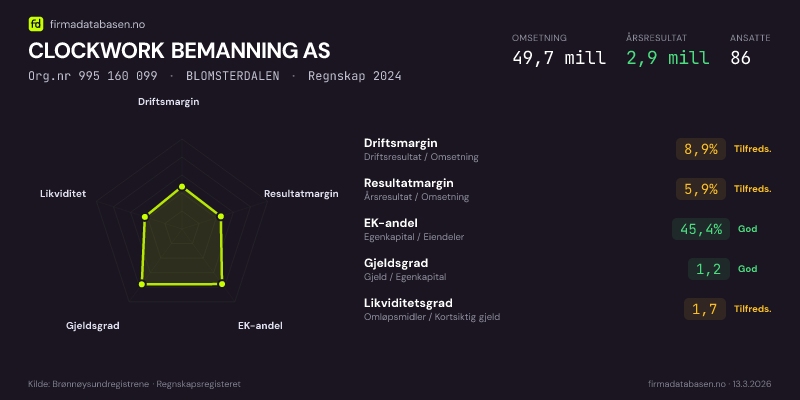 CLOCKWORK BEMANNING AS,BLOMSTERDALEN — jo større areal, jo sterkere økonomi.Org.nr 995 160 099 · Regnskap2024