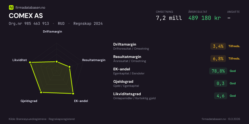 COMEX AS hadde en omsetning på 7,2 MNOK for regnskapsåret 2024 ifølge siste innsendte årsregnskap. Regnskapstallene hentes fra Brønnøysundregistrene.