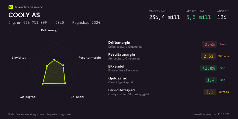 COOLY AS hadde en omsetning på 236,4 MNOK for regnskapsåret 2024 ifølge siste innsendte årsregnskap. Regnskapstallene hentes fra Brønnøysundregistrene.