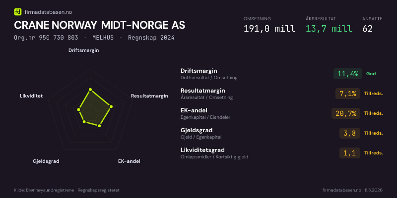 CRANE NORWAY MIDT-NORGE AS,MELHUS — jo større areal, jo sterkere økonomi.Org.nr 950 730 803 · Regnskap2024