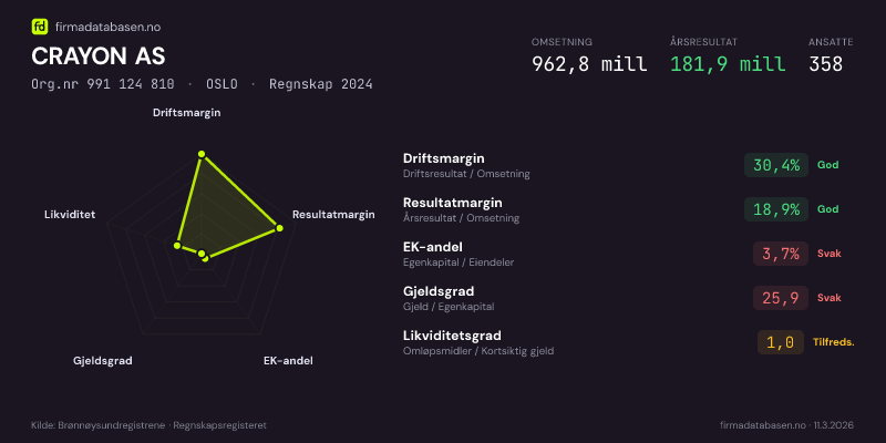 CRAYON AS hadde en omsetning på 962,8 MNOK for regnskapsåret 2024 ifølge siste innsendte årsregnskap. Regnskapstallene hentes fra Brønnøysundregistrene.