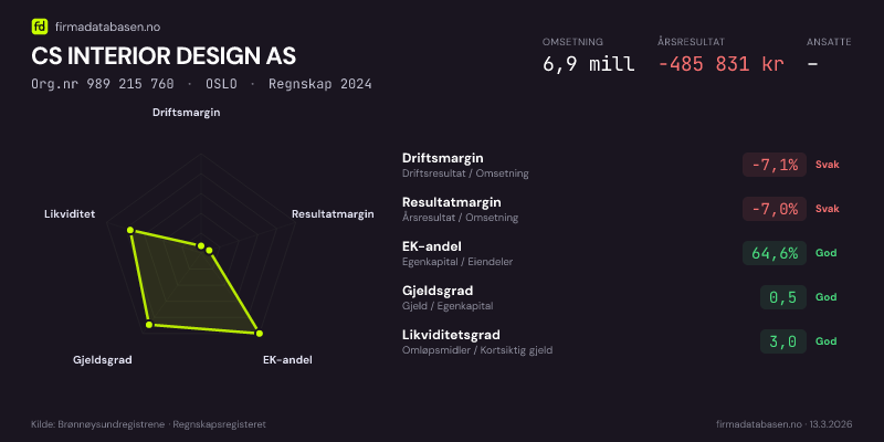 Firmadatabasen.no oppdateres nattlig med nye data fra Brønnøysundregistrene. Endringer i roller, adresse, status og andre registerdata fanges opp automatisk. Du kan følge CS INTERIOR DESIGN AS og få varsel på e-post når vi registrerer endringer — klikk «Følg selskap» øverst på denne siden.