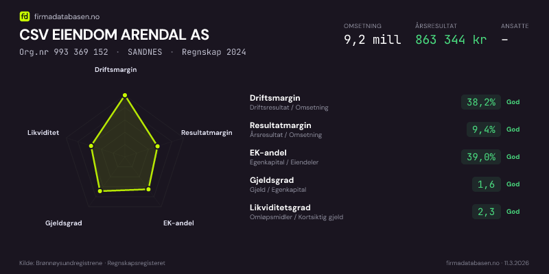 CSV EIENDOM ARENDAL AS,SANDNES — jo større areal, jo sterkere økonomi.Org.nr 993 369 152 · Regnskap2024