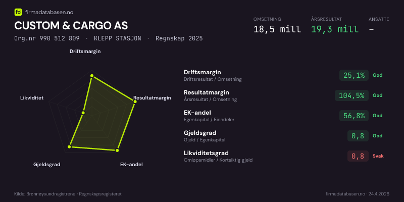 CUSTOM & CARGO AS,KLEPP STASJON — jo større areal, jo sterkere økonomi.Org.nr 990 512 809 · Regnskap2024