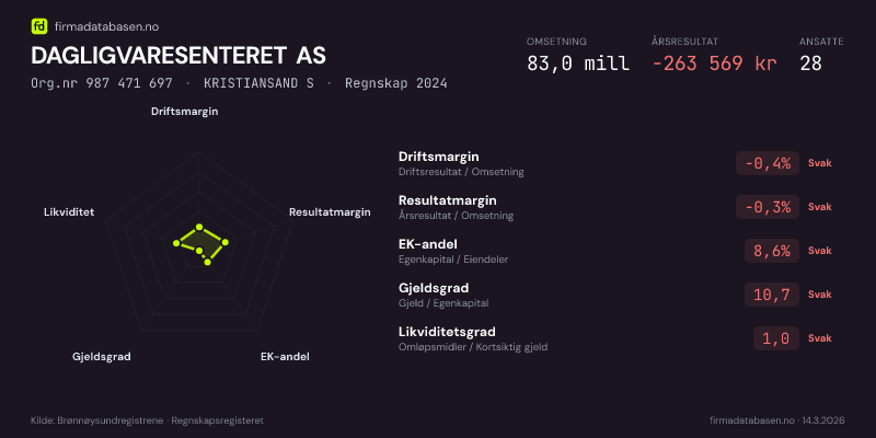 DAGLIGVARESENTERET AS hadde en omsetning på 83.0 mill i 2024, med driftsmargin på -0.4%.