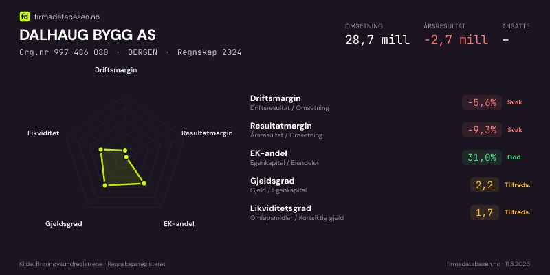DALHAUG BYGG AS hadde en omsetning på 28.7 mill i 2024, med driftsmargin på -5.6%.