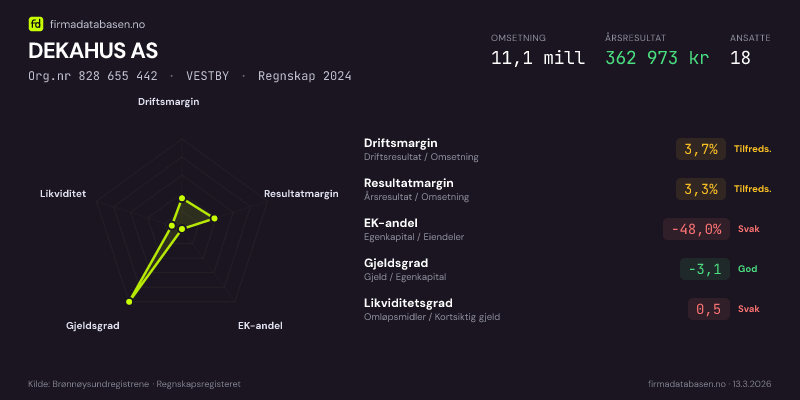 DEKAHUS AS hadde en omsetning på 11,1 MNOK for regnskapsåret 2024 ifølge siste innsendte årsregnskap. Regnskapstallene hentes fra Brønnøysundregistrene.