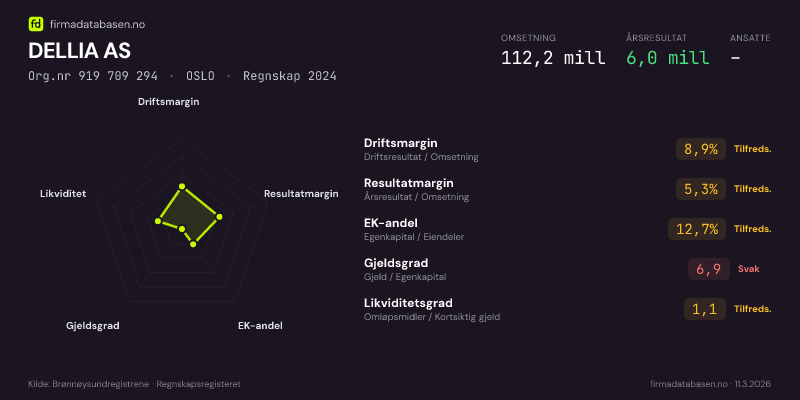 DELLIA AS hadde en omsetning på 112,2 MNOK for regnskapsåret 2024 ifølge siste innsendte årsregnskap. Regnskapstallene hentes fra Brønnøysundregistrene.