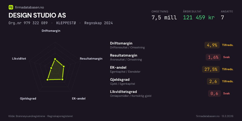 DESIGN STUDIO AS,KLEPPESTØ — jo større areal, jo sterkere økonomi.Org.nr 979 322 089 · Regnskap2024