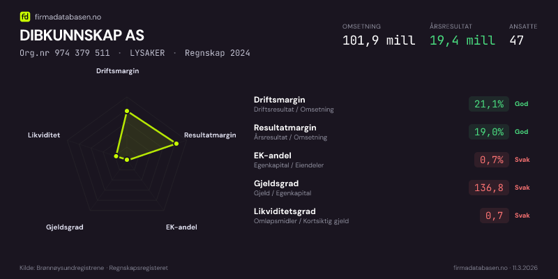 DIBKUNNSKAP AS hadde en omsetning på 101,9 MNOK for regnskapsåret 2024 ifølge siste innsendte årsregnskap. Regnskapstallene hentes fra Brønnøysundregistrene.