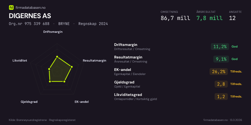 DIGERNES AS hadde en omsetning på 86.7 mill i 2024, med driftsmargin på 11.2%.