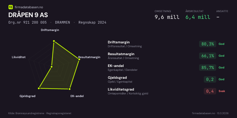 DRÅPEN 9 AS hadde en omsetning på 9,6 MNOK for regnskapsåret 2024 ifølge siste innsendte årsregnskap. Regnskapstallene hentes fra Brønnøysundregistrene.