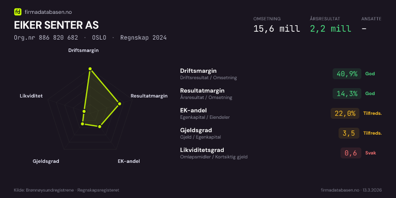 EIKER SENTER AS hadde en omsetning på 15,6 MNOK for regnskapsåret 2024 ifølge siste innsendte årsregnskap. Regnskapstallene hentes fra Brønnøysundregistrene.