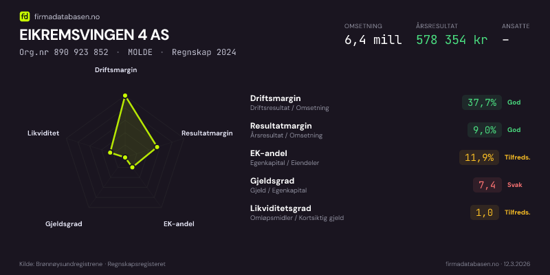 EIKREMSVINGEN 4 AS,MOLDE — jo større areal, jo sterkere økonomi.Org.nr 890 923 852 · Regnskap2024