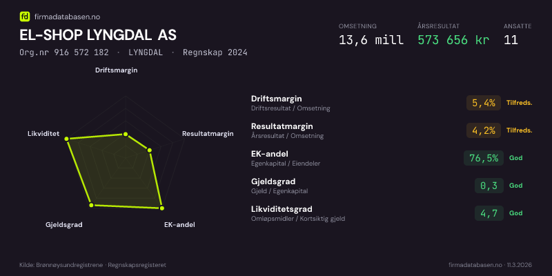 EL-SHOP LYNGDAL AS hadde en omsetning på 13.6 mill i 2024, med driftsmargin på 5.4%.