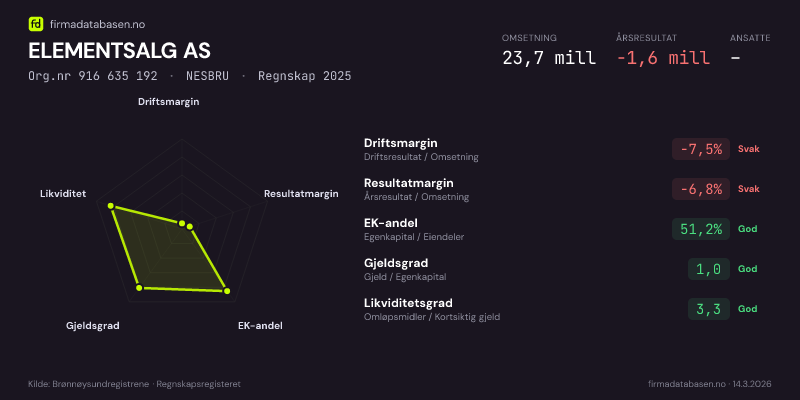 ELEMENTSALG AS hadde en omsetning på 23,7 MNOK for regnskapsåret 2025 ifølge siste innsendte årsregnskap. Regnskapstallene hentes fra Brønnøysundregistrene.