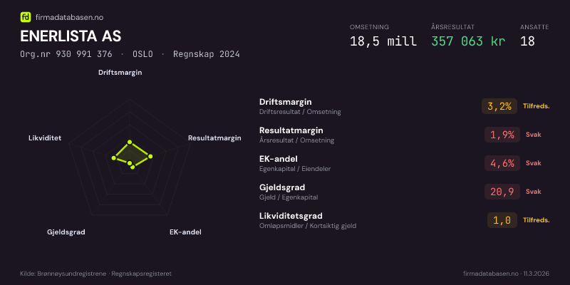 ENERLISTA AS hadde en omsetning på 18,5 MNOK for regnskapsåret 2024 ifølge siste innsendte årsregnskap. Regnskapstallene hentes fra Brønnøysundregistrene.