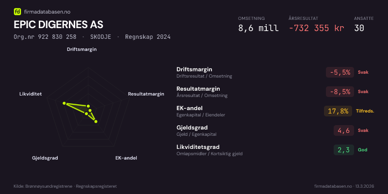 EPIC DIGERNES AS hadde en omsetning på 8,6 MNOK for regnskapsåret 2024 ifølge siste innsendte årsregnskap. Regnskapstallene hentes fra Brønnøysundregistrene.
