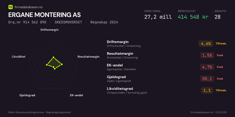 ERGANE MONTERING AS hadde en omsetning på 41.7 mill i 2022, med driftsmargin på 5.5%.