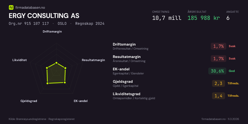 ERGY CONSULTING AS hadde en omsetning på 10,7 MNOK for regnskapsåret 2024 ifølge siste innsendte årsregnskap. Regnskapstallene hentes fra Brønnøysundregistrene.