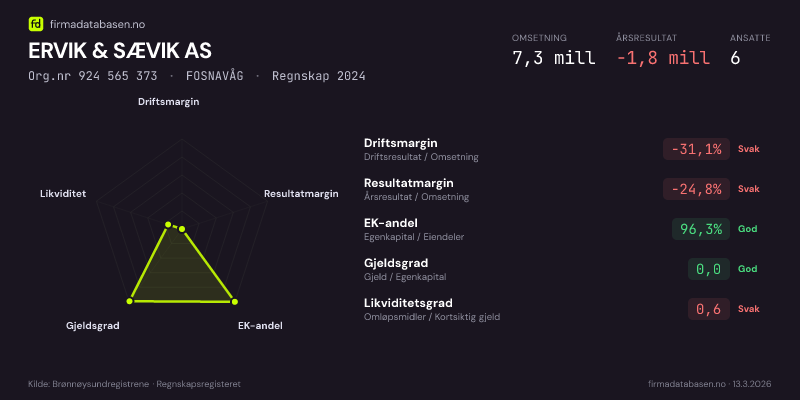 Firmadatabasen.no oppdateres nattlig med nye data fra Brønnøysundregistrene. Endringer i roller, adresse, status og andre registerdata fanges opp automatisk. Du kan følge ERVIK & SÆVIK AS og få varsel på e-post når vi registrerer endringer — klikk «Følg selskap» øverst på denne siden.