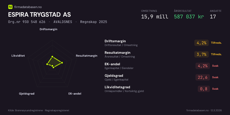 ESPIRA TRYGSTAD AS hadde en omsetning på 15,9 MNOK for regnskapsåret 2025 ifølge siste innsendte årsregnskap. Regnskapstallene hentes fra Brønnøysundregistrene.