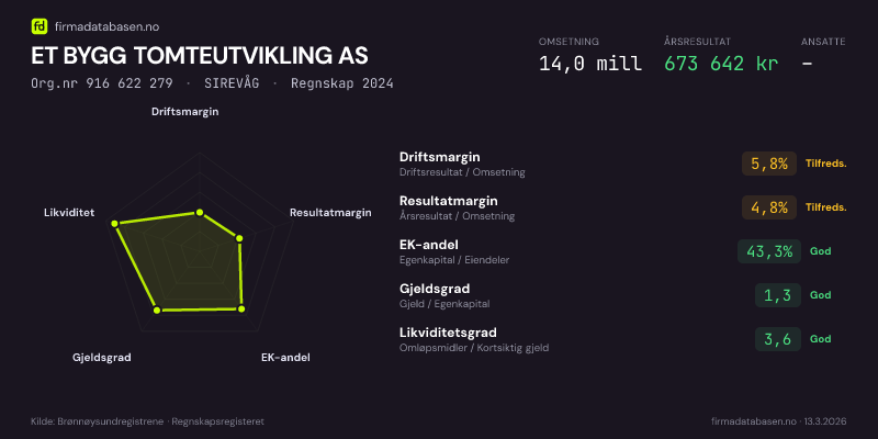ET BYGG TOMTEUTVIKLING AS,SIREVÅG — jo større areal, jo sterkere økonomi.Org.nr 916 622 279 · Regnskap2024