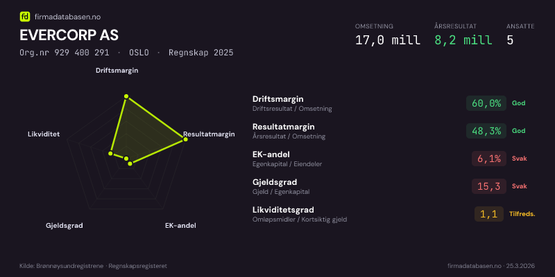 EVERCORP AS hadde en omsetning på 17,0 MNOK for regnskapsåret 2025 ifølge siste innsendte årsregnskap. Regnskapstallene hentes fra Brønnøysundregistrene.