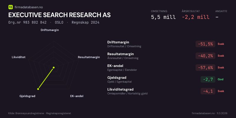 Firmadatabasen.no oppdateres nattlig med nye data fra Brønnøysundregistrene. Endringer i roller, adresse, status og andre registerdata fanges opp automatisk. Du kan følge EXECUTIVE SEARCH RESEARCH AS og få varsel på e-post når vi registrerer endringer — klikk «Følg selskap» øverst på denne siden.