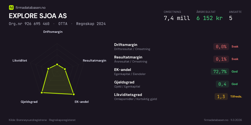 EXPLORE SJOA AS hadde en omsetning på 7,4 MNOK for regnskapsåret 2024 ifølge siste innsendte årsregnskap. Regnskapstallene hentes fra Brønnøysundregistrene.